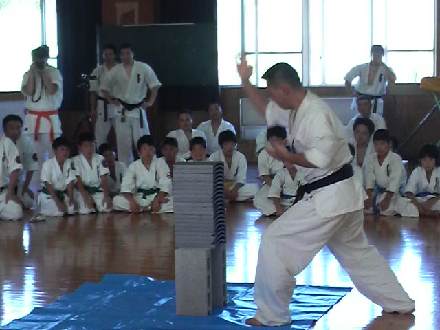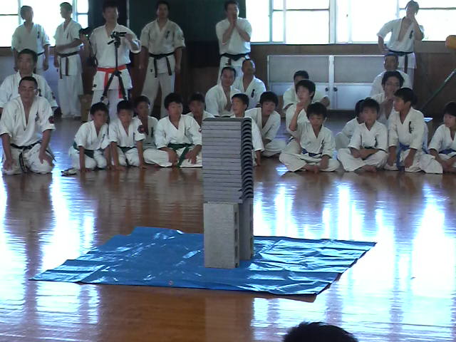 手刀での挑戦です。当然1回では割れません。3回目で全部割れましたが2段の先輩の手からは血が